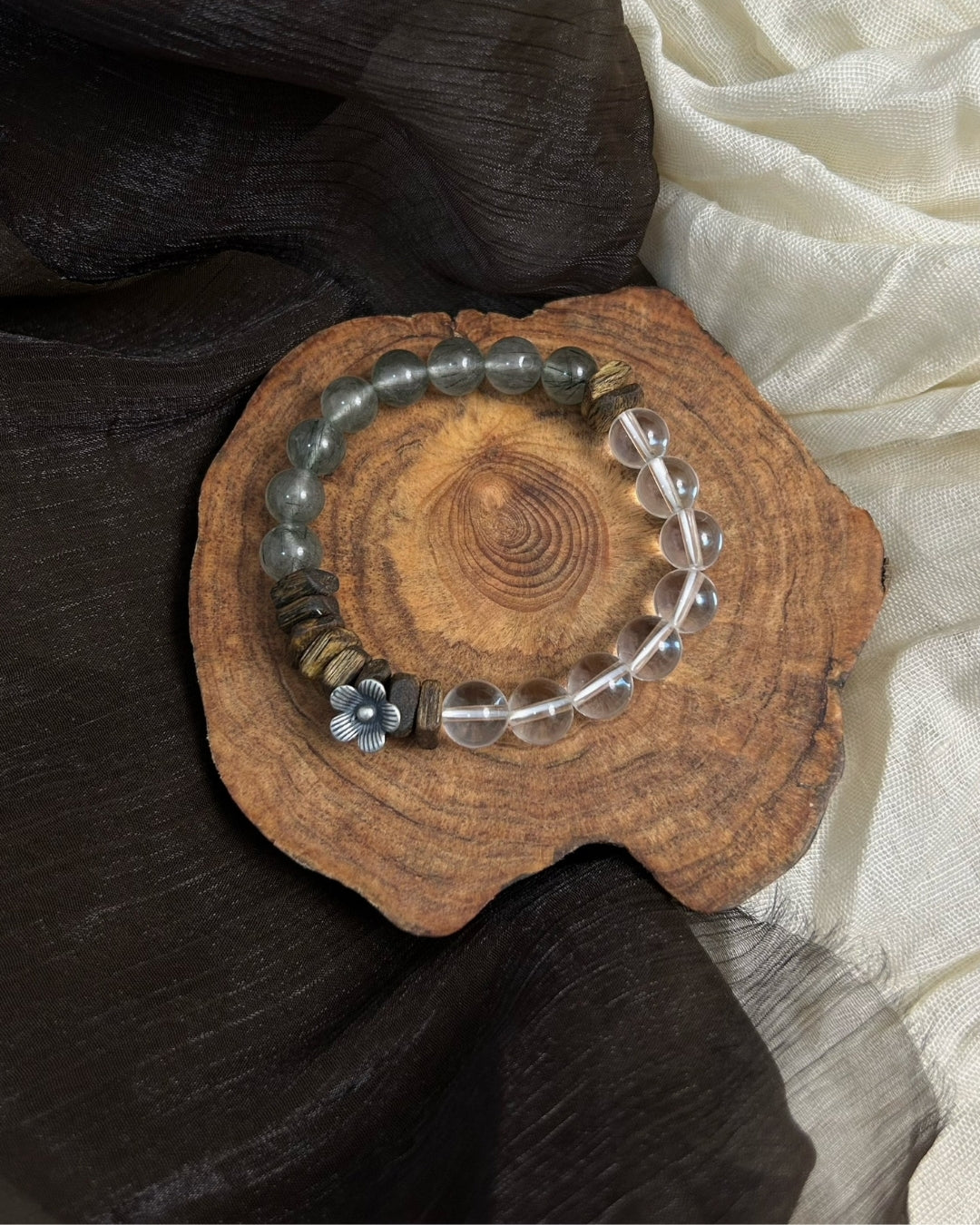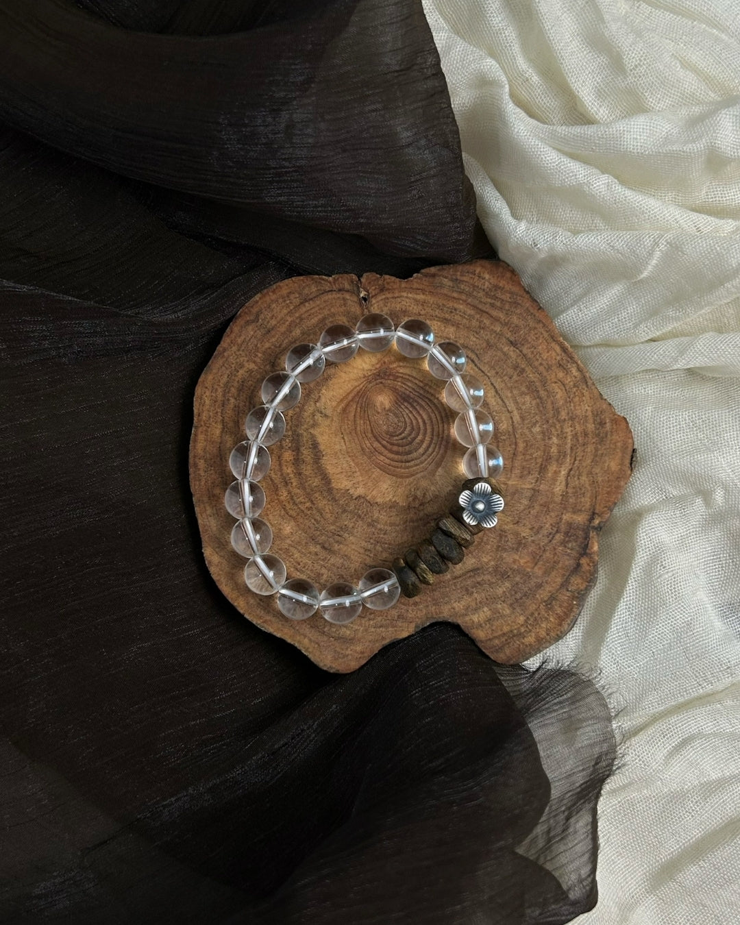 Crystal-clear rock crystal rounds pair with earthy agarwood accents and a delicate 925 silver blossom for a serene, tactile balance. Minimalist yet expressive—wear solo for quiet clarity or stack for a textured, Zen-inspired look. Lightweight, unisex, and effortlessly refined.