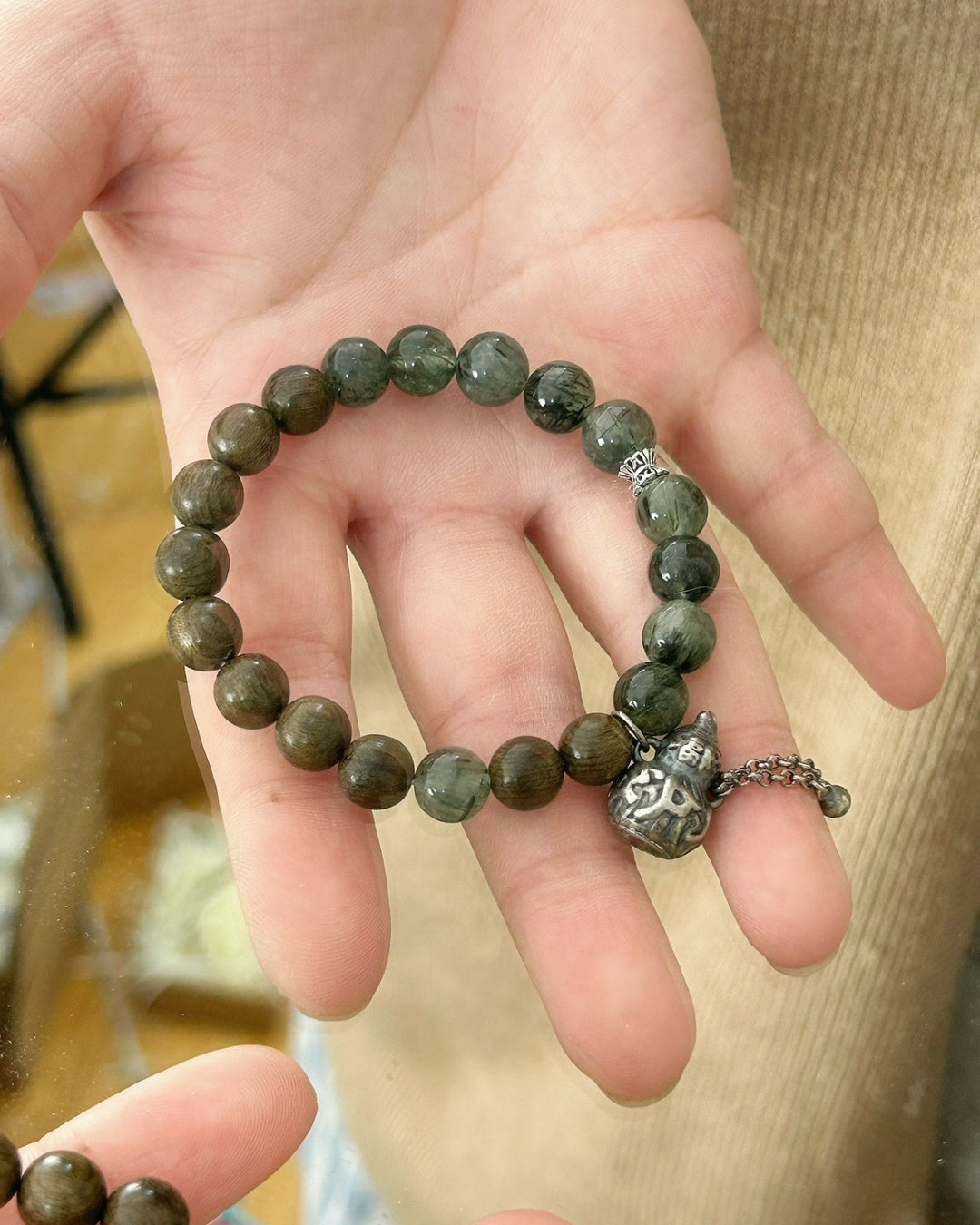Carefree balances warm darkwood with cool green crystal, finished with sterling‑silver accents and a playful charm. Hand‑strung on durable stretch cord for a relaxed, comfortable, unisex fit—earthy, calming, and easy to stack or gift.