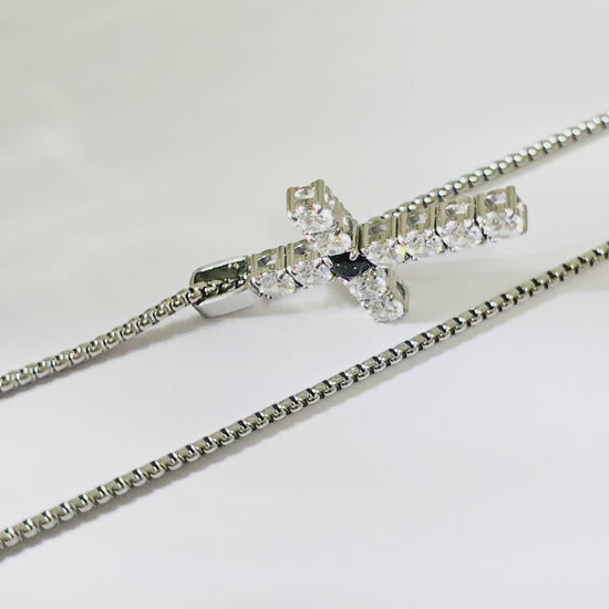 A timeless cross pendant crafted in polished silver‑tone metal, featuring a striking black center stone framed by brilliant white pavé rounds. Suspended from a sleek box chain, it blends modern contrast with classic meaning—perfect for everyday wear or gifting.