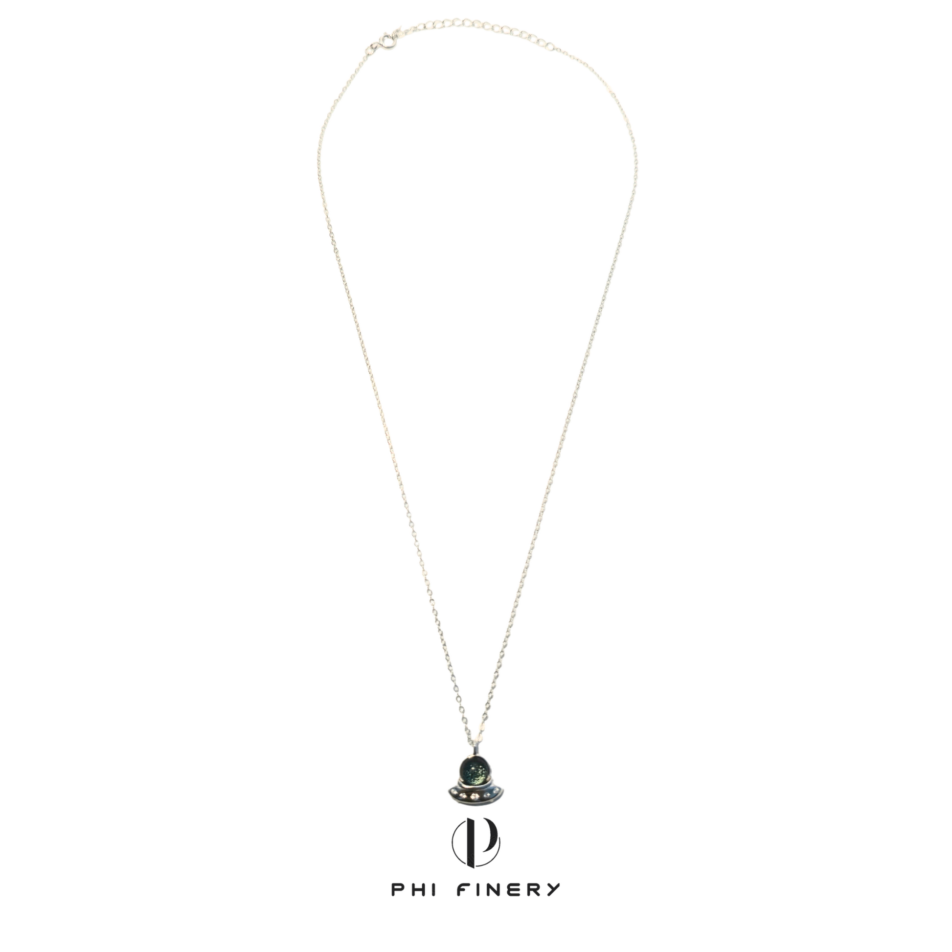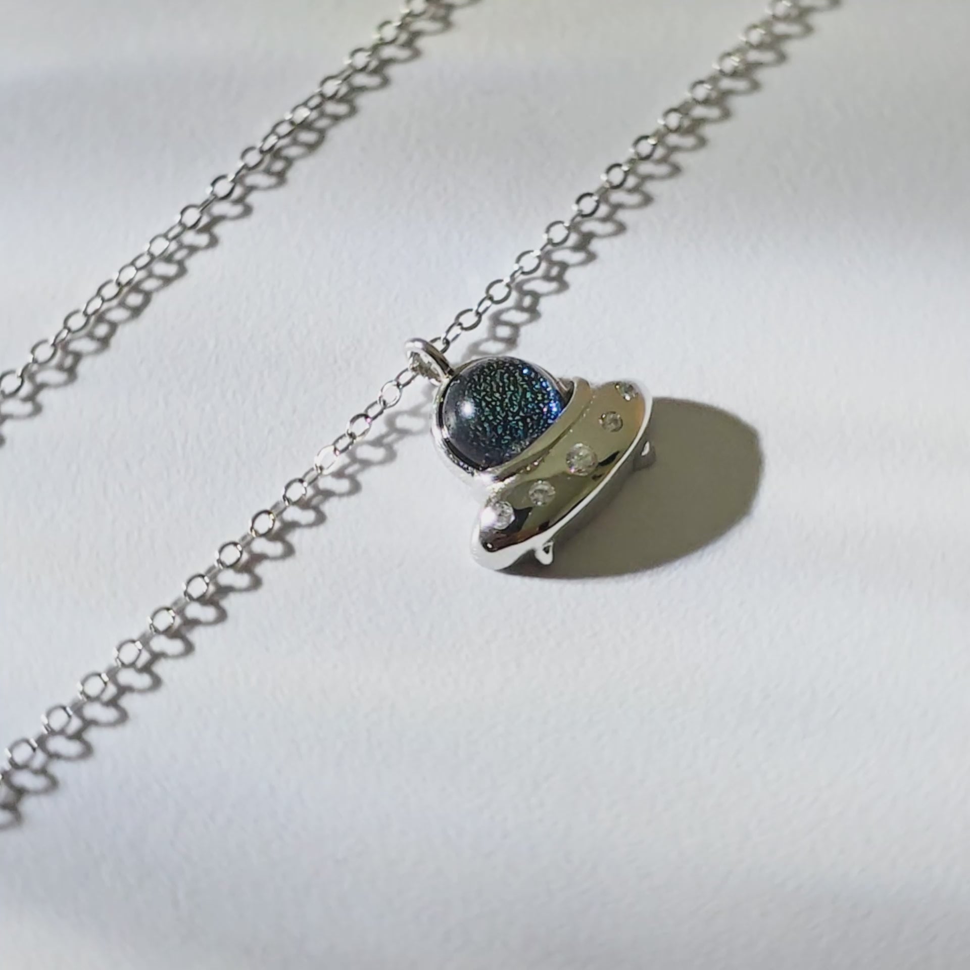 A miniature UFO charm with an iridescent “cockpit” and twinkling pavé lights, cast in a polished silver tone. Playful yet refined, it nods to timeless cosmic mysteries and adds a subtle sparkle to everyday looks—perfect for sci‑fi lovers and starry‑eyed dreamers.