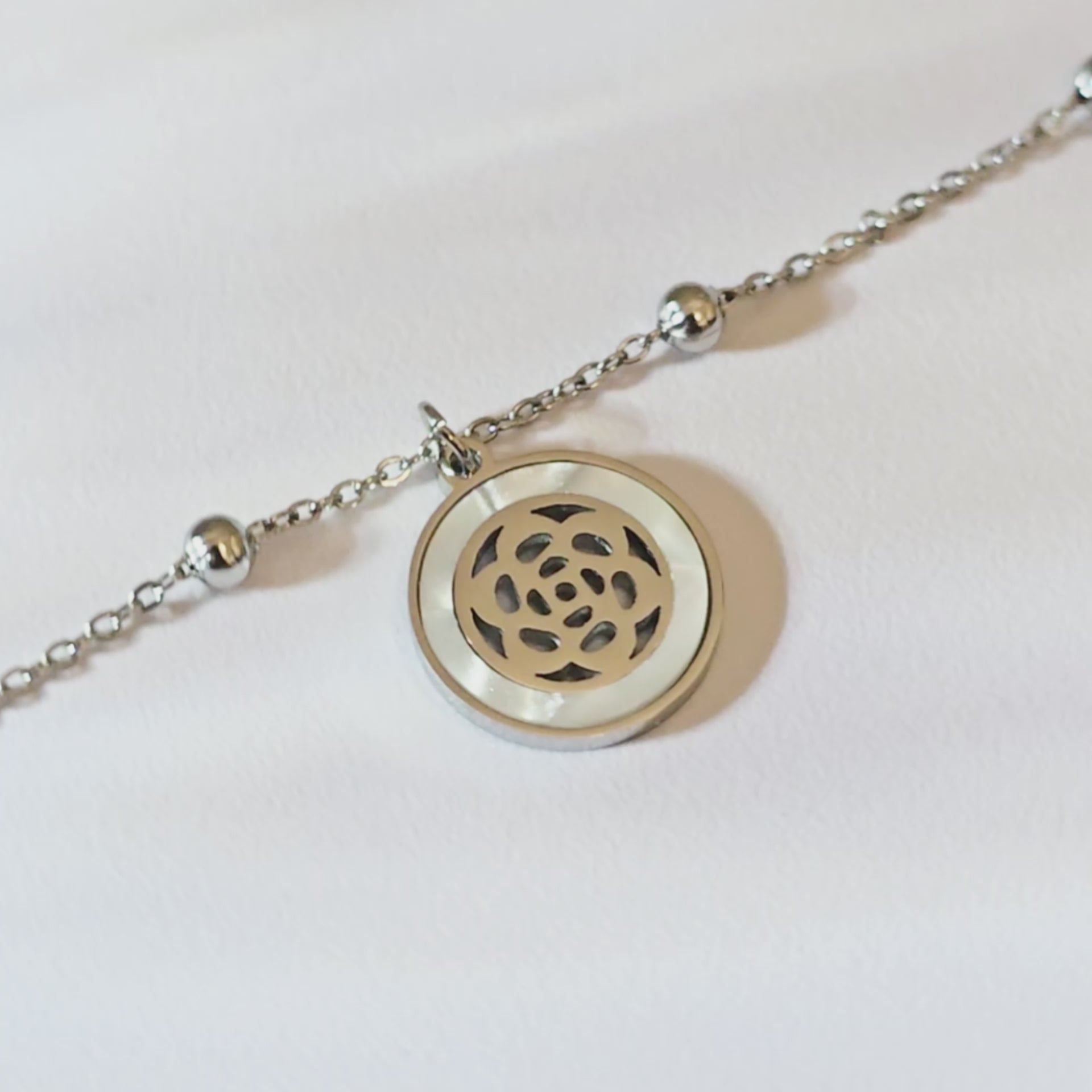 A gleaming round pendant with an openwork lotus motif hangs from a delicate beaded station chain. Minimal, serene, and perfect for everyday wear—beautiful solo or layered.