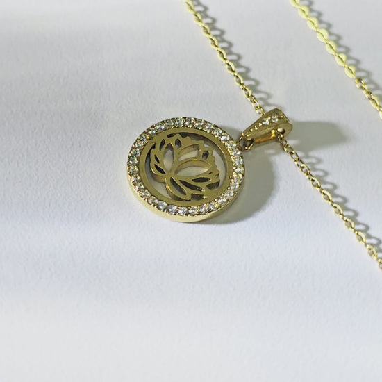 An openwork lotus blooms within a sparkling pavé halo, symbolising purity, resilience, and renewal. Finished in luminous gold tone with handset crystals, this delicate pendant adds a serene shimmer to everyday wear and makes a meaningful gift.