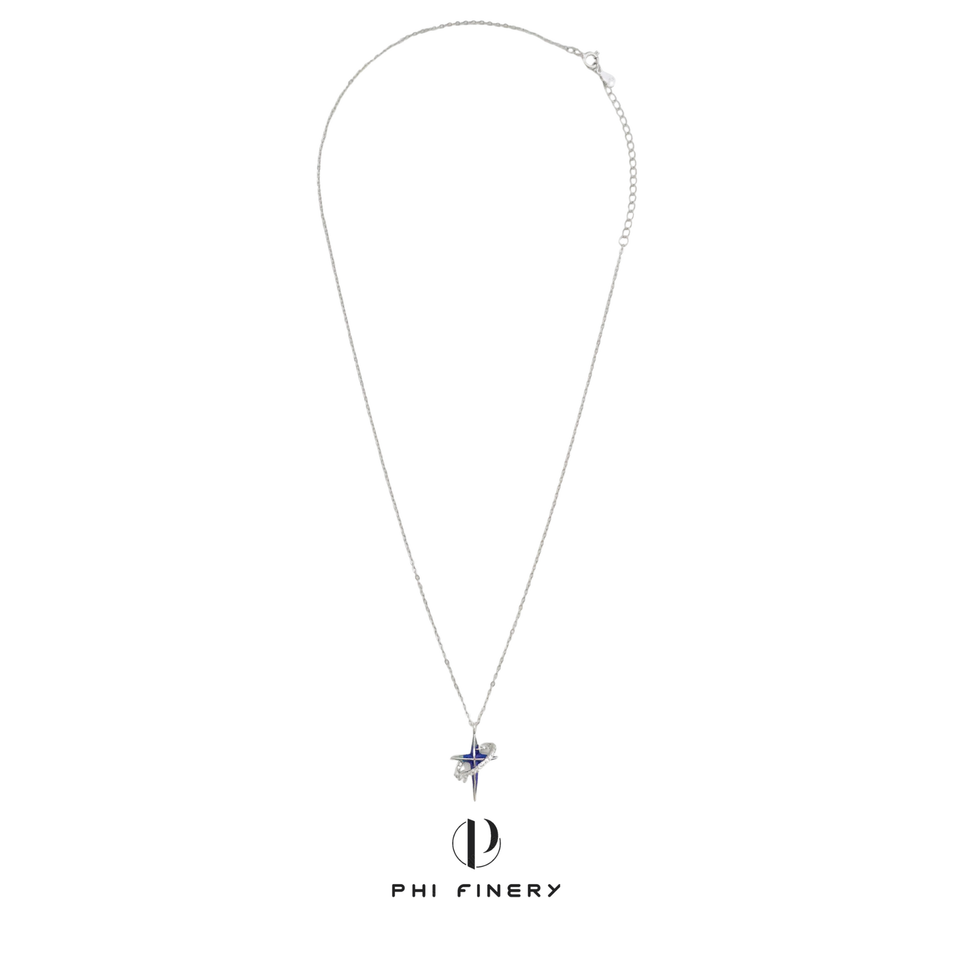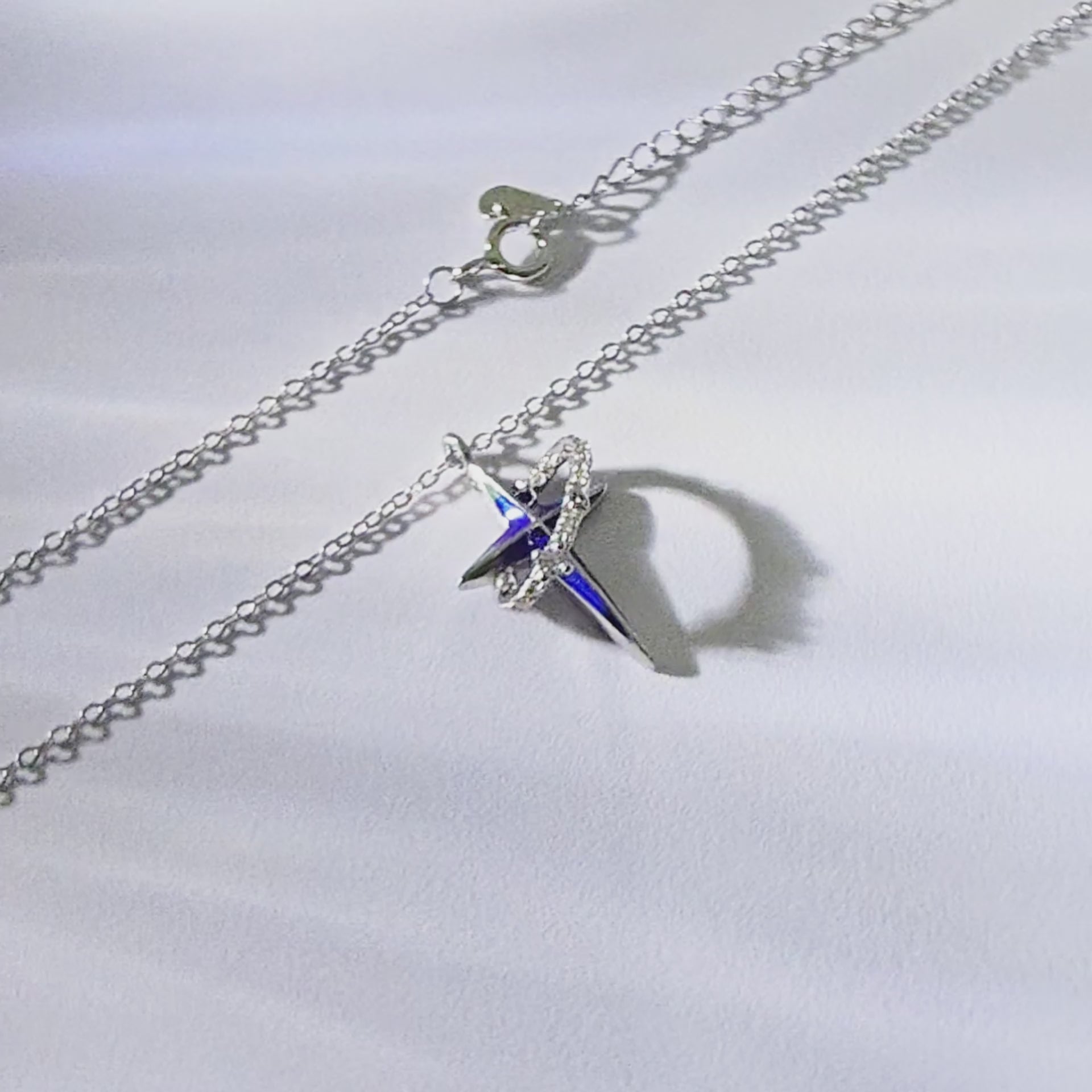 A midnight‑blue star is encircled by a pavé crystal halo, capturing that “all eyes on you” energy. Sleek, modern, and a little cosmic—made to shine from day to night.